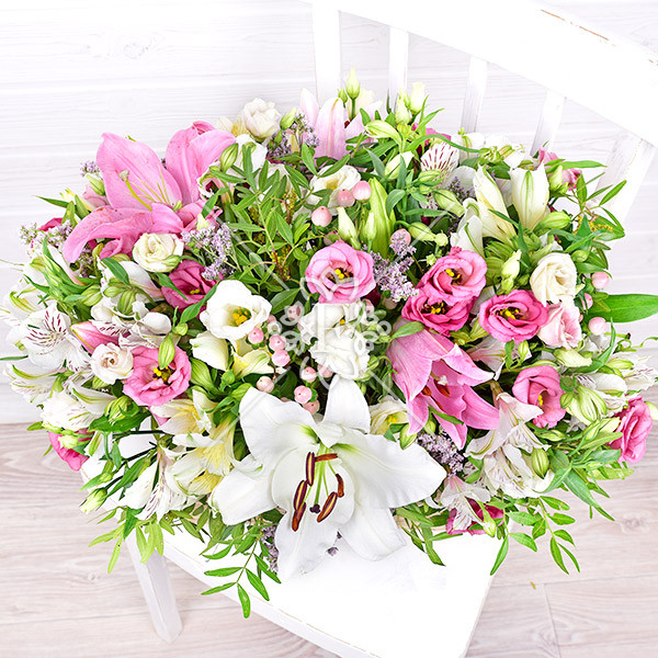 В составе этой изумительной композиции белоснежные и розовые лилии, молочно-белая и нежно-розовая эустома, ванильная альстромерия, розовый гиперикум,фиолетовый лимониум и зелень фисташки.